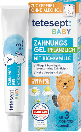 Das pflanzliche Baby Zahnungsgel von tetesept wurde speziell für beanspruchtes Zahnfleisch beim Durchbruch der ersten Zähnchen entwickelt. Die Formulierung mit Pflanzenextrakten aus Aloe Vera, Nelke und Bio-Kamille kann das Zahnfleisch beruhigen. Zudem ist die pflanzliche Pflege frei von Alkohol sowie Zucker und eignet sich für Babys ab drei Monaten.