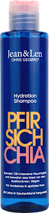 Im Hydration Shampoo Pfirsich Chia von Jean&Len verbindet sich ein fruchtig-frischer Duft mit einer sanften, veganen Pflegeformel. Pflanzliches Glycerin sowie Pfirsich- und Chiasamen-Extrakt spenden dem Haar bis zu 72 Stunden intensive Feuchtigkeit und bewahren es vor dem Austrocknen. Durch den Verzicht auf Silikone, Parabene, Mineralöl und Inhaltsstoffe tierischen Ursprungs bleibt die Pflege besonders mild. Das Haar erhält spürbare Geschmeidigkeit und einen seidigen Glanz. So wird jede Haarwäsche zum verwöhnenden Frische-Erlebnis.