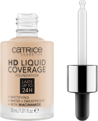 Auf der Suche nach einer neuen Lieblingsfoundation? Die HD Liquid Coverage Foundation glänzt mit natürlich aussehender Deckkraft und der ultra-leichten Textur. Wenn es noch ein wenig natürlicher sein soll, dann kann die Foundation auch mit Sonnencreme vermischt und zusammen auf das Gesicht aufgetragen werden. Die Übergänge am Haaransatz und am Kinn gut verblenden und in die Haut einarbeiten und voilá! Perfekter Teint bis zu 24h lang.