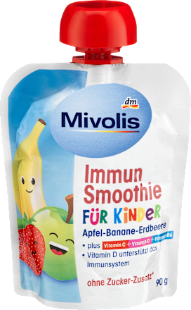 Mivolis Immun Smoothie für KInder unterstützt das normale Immunsystem bei Kindern mit Vitamin D. Kinder ab 4 Jahren, Jugendliche und Erwachsene verzehren einmal täglich den Inhalt eines Quetschbeutels. Für den besten Genuss durchmischen Sie den Inhalt vor dem Verzehr bitte durch mehrfaches Drücken des geschlossenen Quetschbeutels.