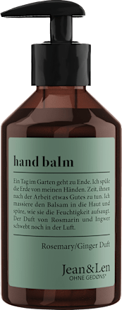 Mit dem Rosemary & Ginger Hand Balm von Jean&Len wird die Handpflege zu einem wohltuenden Erlebnis für die Sinne. Dieser reichhaltige Balsam verwöhnt die Hände mit pflegenden Inhaltsstoffen wie Bio-Arganöl, Sheabutter und Vitamin E. Die Formulierung zieht schnell ein und hinterlässt ein samtweiches Hautgefühl, während der belebende Duft von Rosmarin und Ingwer die Sinne verwöhnt. Zudem ist der Handbalm pH-hautneutral und frei von unnötigen Zusätzen. Für rundum gepflegte und geschmeidige Hände – jeden Tag.