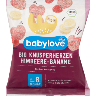 Die Bio-Knusperherzen mit Himbeere-Banane von babylove bestehen aus Mais und glutenfreiem Hafer. Dank des lecker-fruchtigen Geschmackes eignen sie sich auch ideal als Snack für zwischendurch – auch für die Erwachsenen. Zudem sind die Knusperherzen für Babys ab dem 8. Monat besonders leicht zu kauen.