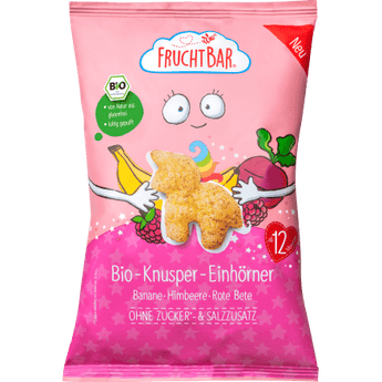 Der Bio-Knusper-Einhörner Kindersnack von FruchtBar eignet sich für Kinder ab 12 Monaten. Der Snack mit leckerem Mais und Fruchtpulver aus Himbeere, Banane sowie roter Bete ist ein wahrer Genuss. Das rosa Pulver zaubert einen fruchtigen Geschmack in die kleinen Einhörner.