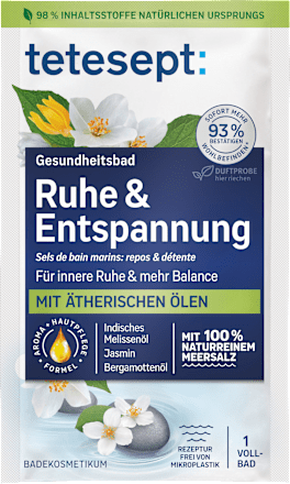 Add tetesept sea salt to the running bath water. Enjoy your bath for 10–20 minutes at 35–38°C. After use, rinse the bathtub with hot water to remove any product residue.