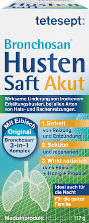 tetesept Bronchosan® Acute Cough Syrup soothes irritation in all types of coughs associated with colds, effectively relieving the respiratory tract and its typical symptoms. The original Bronchosan 3-in-1 complex with marshmallow, honey, and propolis works in three ways: it relieves respiratory irritation, protects and regenerates irritated mucous membranes in the throat and pharynx, and works naturally thanks to its unique combination of natural ingredients. This item is available for express orders or in our dm stores.