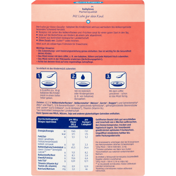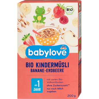 Ingredients: 62.5% WHOLE GRAIN OAT FLAKES*, WHOLE GRAIN FLOUR (WHEAT*, BARLEY*, RYE*) and cereal flour* (rice* and corn*), 12% banana flakes*, 5% dried apple pieces*, freeze-dried berry pieces and powder* (1.6% strawberry*, 0.4% raspberry*), thiamine (vitamin B1). *from organic farming