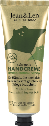 Jean&Len's hand cream with the delicate Rosemary & Ginger fragrance is ideal for stressed and dry hands. Thanks to its special formula with urea and hyaluronic acid, it perfectly meets the skin's needs, leaving it feeling nourished. Enriched with cupuaçu butter and vitamin E, it absorbs quickly. Free from microplastics, mineral oil, parabens, paraffins, dyes, and silicones, and with its vegan formula, it's a popular choice.