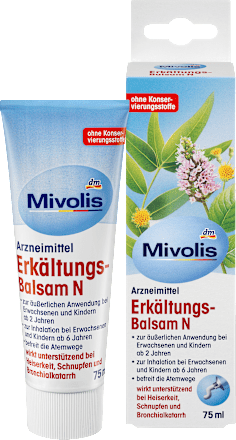 Mivolis Bálsamo para el Resfriado N alivia de forma reconfortante en caso de resfriado y ronquera. Los principios activos contenidos en el Bálsamo para el Resfriado N alivian los síntomas del resfriado. Frotar el pecho y la espalda o realizar una inhalación con Mivolis Bálsamo para el Resfriado N favorece una respiración libre. Mivolis Bálsamo para el Resfriado N es apto para uso externo en adultos y niños a partir de 2 años y como aplicación adicional para inhalación en adultos y niños a partir de 6 años.