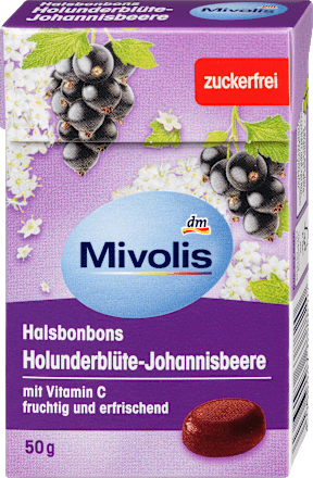 Los caramelos sin azúcar Mivolis con sabor a saúco y grosella negra, con edulcorantes y vitamina C, son especialmente agradables al paladar gracias al extracto de flor de saúco.