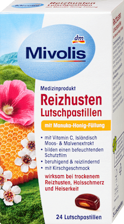 Las pastillas para la tos irritativa Mivolis con relleno de miel de Manuka proporcionan una hidratación eficaz de la zona bucal, de la garganta y la faringe gracias a su especial combinación de principios activos de extractos de malva y musgo islandés. Los principios activos forman una película protectora sobre las mucosas irritadas y secas, aliviando de forma suave los síntomas típicos del resfriado como la tos irritativa, el dolor de garganta y la ronquera. Como resultado, el dolor se alivia.