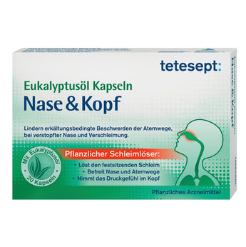 Las cápsulas de aceite de eucalipto Nariz + Cabeza de tetesept son ideales durante la temporada de resfriados y los síntomas asociados. Cuando la nariz está congestionada o con mucosidad y se presentan molestias en las vías respiratorias, el aceite de eucalipto contenido puede proporcionar un alivio agradable. Además, puede ayudar a aliviar la sensación de presión en la cabeza. Este artículo está disponible para pedidos exprés o en nuestros mercados dm.