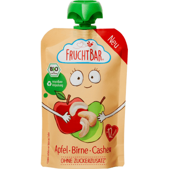 Todellinen kumppani retkille, matkoilla tai välipalaksi. FruchtBarin omena-, päärynä- ja cashew-sose on sopiva 12 kuukauden iästä alkaen, ja sen käytännöllisen pakkauksen ja juomaosan ansiosta sitä voi nauttia missä tahansa.