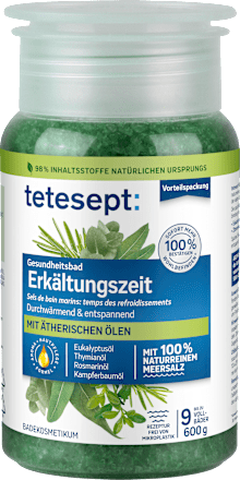 tetesept Merisuola Flunssaan on erityinen kylpytuote iholle hellävaraisen merisuolan pohjalta, joka parantaa hyvinvointia flunssakaudella. Se on hyväksi hengitysteille ja 100 % luonnollinen. Ainutlaatuinen yhdistelmä sisältää 4 eteeristä öljyä eukalyptuksesta, timjamista, rosmariinista ja kamferista.