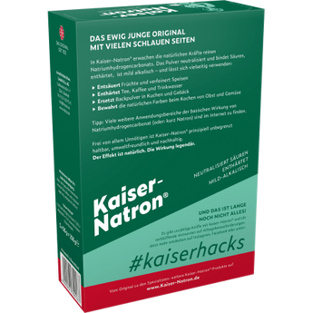 La poudre Kaiser-Natron en grand format de 250 g est un véritable produit polyvalent authentique. Le bicarbonate de soude est en effet une substance fascinante pour réussir vos plats et pâtisseries sensationnelles. De plus, il offre encore de très nombreuses autres possibilités d’utilisation.