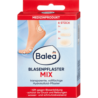 Les pansements anti-ampoules transparents Balea Mix avec hydrocolloïde intégral conviennent pour prévenir et protéger contre les ampoules aux pieds. Les pansements absorbent le liquide des ampoules et offrent un effet coussin. De plus, ces pansements sont résistants à l'eau et à la saleté.
