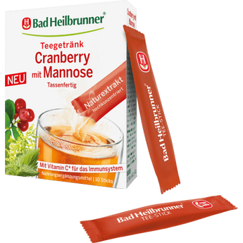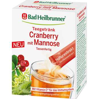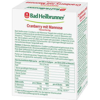 Le thé Bad Heilbrunner Cranberry avec Mannose contient du concentré de jus de canneberge et un extrait d'ortie ainsi que de la D-mannose et de la vitamine C. La vitamine C contribue au bon fonctionnement du système immunitaire et la canneberge est particulièrement appréciée des femmes. La D-mannose est également un monosaccharide apparenté au glucose, produit en petites quantités dans le corps humain.