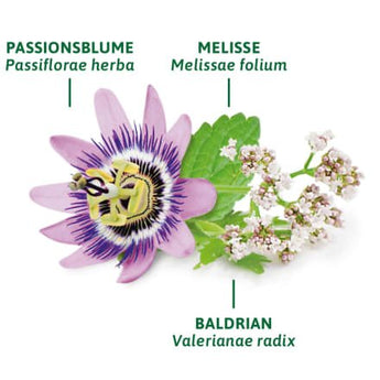Substances actives en type et quantité : 1 sachet filtre de 1,75 g contient comme substances actives : 0,53 g de racine de valériane coupée, 0,48 g d’herbe de passiflore coupée, 0,40 g de feuilles de mélisse coupées. Autres ingrédients : feuilles de menthe poivrée, achillée millefeuille, racine de réglisse, fleurs de camomille, tous coupés