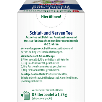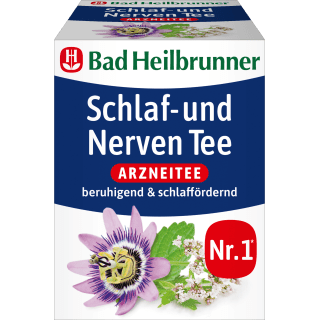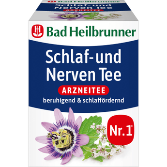 La tisane Bad Heilbrunner Sommeil et Nerfs a un effet apaisant et favorise le sommeil. Un sachet filtre sans agrafe métallique contient 1,75 g de racine de valériane coupée, d’herbe de passiflore et de feuilles de mélisse, de feuilles de menthe poivrée, d’achillée millefeuille, de racine de réglisse et de fleurs de camomille. Cette tisane médicinale aide de manière naturelle contre les états d’agitation et les troubles du sommeil d’origine nerveuse.