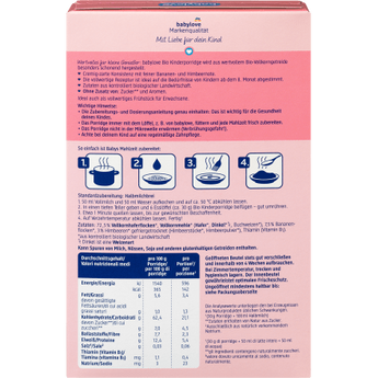 Ingrédients : 62,5 % FLOCONS D’AVOINE COMPLETS*, FARINES COMPLÈTES* (BLÉ*, ORGE*, SEIGLE*) et farines de céréales* (riz* et maïs*), 12 % flocons de banane*, 5 % morceaux de pomme séchés*, morceaux et poudre de baies lyophilisés* (1,6 % fraise*, 0,4 % framboise*), thiamine (vitamine B1). *issu de l’agriculture biologique contrôlée