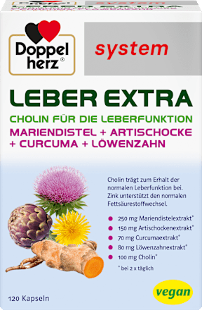 Le foie remplit de nombreuses fonctions dans le métabolisme. En tant qu'organe métabolique central, il intervient par exemple dans l'utilisation des nutriments, la régulation du métabolisme des graisses et la production de la bile. Une alimentation riche en graisses et un manque d'exercice peuvent solliciter notre foie, d'autres organes digestifs et notre métabolisme. Pour un foie et une digestion sains, une alimentation pauvre en graisses et équilibrée, apportant suffisamment de nutriments à notre corps, est importante. La choline contenue dans Doppelherz system LEBER EXTRA contribue au métabolisme lipidique normal et participe au fonctionnement normal du foie. L'utilisation du chardon-Marie, de l'artichaut, du curcuma et de la menthe poivrée repose sur une longue tradition. Le pissenlit (Taraxacum officinale) appartient à la famille des astéracées et est désormais utilisé, entre autres, comme ingrédient dans le pesto, la confiture et les salades. Le zinc contribue au métabolisme normal des acides gras et aide en outre à protéger les cellules contre le stress oxydatif. Le zinc contribue également au métabolisme normal des glucides, de la vitamine A et de l'équilibre acido-basique. La vitamine B2 contribue au métabolisme énergétique normal et participe en outre à la réduction de la fatigue et de l'épuisement. Prendre 2 gélules par jour lors d'un repas avec une quantité suffisante de liquide, sans croquer.