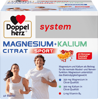 MAGNESIUM + POTASSIUM CITRATE de Doppelherz system contient les deux minéraux magnésium et potassium sous forme de citrate. Les citrates sont les composés organiques de ces minéraux. Le magnésium est un minéral essentiel que l'organisme ne peut pas synthétiser. De plus, son stockage n'est possible que dans une mesure limitée. Un apport suffisant en magnésium contribue à une fonction musculaire normale. Le magnésium soutient le métabolisme énergétique normal ainsi que le fonctionnement normal du système nerveux. Ce minéral participe à l'équilibre électrolytique. Lors d'activités physiques intenses et sportives, des pertes de liquide accrues surviennent souvent, entraînant une perte d'électrolytes importants pour l'organisme. Il est donc important d'apporter suffisamment de liquide et d'électrolytes. Le potassium contribue à une fonction normale du système nerveux et à une fonction musculaire normale. Le magnésium et le potassium collaborent étroitement dans de nombreux processus métaboliques de l'organisme. Un bon apport en potassium bénéficie d'un apport simultané en magnésium, car le magnésium est nécessaire au transport du potassium dans les cellules. La vitamine B6 contribue au métabolisme normal des protéines et du glycogène. En cas d'alimentation déséquilibrée ou d'un besoin accru en nutriments, par ex. en raison d'un mode de vie malsain (comme la consommation de tabac et d'alcool) ou d'efforts physiques intenses, l'alimentation peut être complétée de manière ciblée avec Doppelherz system MAGNESIUM + POTASSIUM CITRATE. Un sachet-dose contient : 350 mg de magnésium, 300 mg de potassium, 5 mg de vitamine B6.