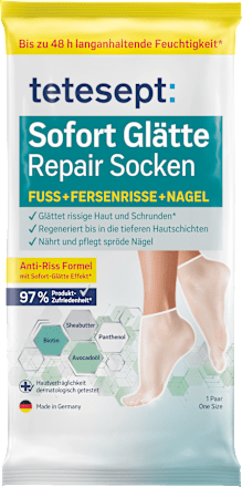 Les chaussettes masque pour pieds tetesept Socken Sofort Glätte Repair offrent un soin agréable pour les pieds fatigués. Grâce à une combinaison de beurre de karité, panthénol, huile d'avocat et biotine, la formule peut lisser immédiatement la peau craquelée et fendillée. En même temps, la peau est hydratée jusqu'à 48 heures et protégée contre le dessèchement. Après l'application, les pieds sont doux et agréablement soyeux.