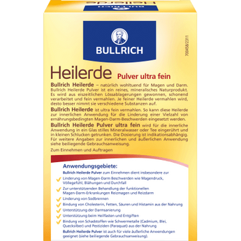 La terre médicinale Bullrich a un effet bienfaisant sur l’estomac et les intestins et convient également pour une cure de désintoxication intestinale. De plus, elle soutient le processus de détoxification et d’élimination des toxines de l’organisme et lie le cholestérol provenant de l’alimentation. Végan.