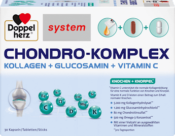 Doppelherz system CHONDRO-KOMPLEX contiene una combinazione particolare di una compressa, una capsula e uno stick liquido e unisce così una vasta gamma di ingredienti in un unico prodotto. I flaconcini porzionati sono da assumere rapidamente e direttamente, senza necessità di liquidi aggiuntivi. Il contenuto ha un gradevole gusto fruttato di pesca. Il prodotto contiene 500 mg di concentrato di Omega-3. Gli acidi grassi Omega-3 EPA/DHA, con un apporto giornaliero di 250 mg, contribuiscono alla normale funzionalità cardiaca. Sono inoltre presenti 5.000 mg di collagene idrolizzato, 1.200 mg di glucosamina cloridrato, 80 mg di condroitin solfato oltre a Coenzima Q10 e luteina. La vitamina C sostiene la normale formazione del collagene per la normale funzione di ossa e cartilagini. Le vitamine K, D e il magnesio contribuiscono al mantenimento di ossa normali. Magnesio e vitamina D supportano inoltre il mantenimento della normale funzione muscolare. La vitamina A e lo zinco contribuiscono alla normale funzione del sistema immunitario. La vitamina E, il selenio, lo zinco e il manganese contribuiscono alla protezione delle cellule dallo stress ossidativo. Il manganese supporta inoltre la normale formazione del tessuto connettivo. Le vitamine del gruppo B (B1, B2, B6, B12), così come biotina, niacina e acido pantotenico, contribuiscono al normale metabolismo energetico. L'apparato locomotore con le sue articolazioni, cartilagini, muscoli, tendini e legamenti è sollecitato quotidianamente. Sollecitazioni unilaterali, sovrappeso e l'avanzare dell'età sono fattori di stress. Per il mantenimento della mobilità e della qualità della vita a qualsiasi età, un'attività fisica adeguata e moderata e un'alimentazione sana possono contribuire.