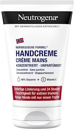Die Neutrogena Handcreme konzentriert unparfümiert bietet sofortige Linderung für extrem trockene, rissige Hände mit nur einem Tropfen. Zudem beruhigt und repariert die Creme die Hände sofort. Die Handcreme für sehr trockene Hände versorgt mit 40 % Glycerin und Vitamin E die Haut 24 h lang mit Feuchtigkeit und schützt wissenschaftlich bewiesen die Hautbarriere. Dank der konzentrierten Formel genügt nur ein Tropfen, zudem ist die Creme auch für sensible Haut geeignet.