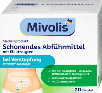 Mivolis Schonendes Abführmittel ist ein modernes, besonders schonend und zuverlässig wirkendes Präparat gegen Verstopfung. Wie funktioniert unsere Verdauung? Der Speisebrei, bestehend aus festen und flüssigen Nahrungsbestandteilen, wird mit körpereigenen Verdauungssäften durchmischt, sodass die mit den Speisen zugeführten Nährstoffe im Dünndarm aufgenommen werden können. Die nicht verwertbaren Bestandteile wie z.B. Ballaststoffe wandern weiter in den Dickdarm. Auf dem weiteren Weg durch den Darm wird kontinuierlich Wasser entzogen, bis ein weicher Stuhl entsteht. Durch die Füllung wird die Darmtätigkeit angeregt und eine Stuhlentleerung ermöglicht. Wie entsteht eine Verstopfung? Die Hauptaufgabe des Dickdarms ist die Aufnahme von Wasser und Mineralstoffen (Elektrolyten) aus dem Stuhl. Wird dem Stuhl zu viel Wasser entzogen, verhärtet dieser und kann nur noch mühsam und manchmal mit Schmerzen abgesetzt werden. Ursache hierfür sind häufig unausgewogene Ernährung, zu geringe Flüssigkeitsaufnahme, zu wenig Bewegung, aber auch bestimmte Medikamente. Wie wirkt Macrogol? Macrogol bewirkt, dass ein normaler, weicher und dadurch leicht entleerbarer Stuhl auf besonders schonende und zuverlässige Weise erreicht wird. Das pulverförmige Macrogol wird in einem Glas Wasser aufgelöst und getrunken. Wie ein unsichtbarer Schwamm bindet Macrogol das Wasser und führt es sicher in den Dickdarm. Im Unterschied zu anderen Abführmitteln bringt Macrogol das zur Stuhlaufweichung erforderliche Wasser auf diese Weise in den Darm ein und entzieht es nicht dem Körper. Eine Gewöhnung oder Wirkungsabschwächung kann bei Macrogol nicht auftreten. Macrogol wird aus dem Körper vollständig und unverändert wieder ausgeschieden. Darüber hinaus sind dem Macrogol Mineralstoffe (Elektrolyte) beigefügt, die den Eleklrolythaushalt im Gleichgewicht halten.