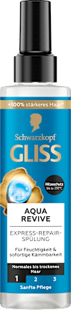 Express-Repair-balsamet Aqua Revive från Schwarzkopf GLISS ger inte bara upp till 48 timmars fukt, utan skyddar även håret mot värme upp till 230 grader. Spraybalsamet vårdar håret skonsamt och ger omedelbar glans samt förbättrad kamning. Det är berikat med hyaluronkomplex och havsalger för intensiv vård.