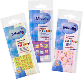 Mivolis plåster för barn är särskilt lämpligt som tröstplåster för sårvård på känslig hud. Plåstret sitter säkert och kan tas bort utan smärta. Plåstret är hudvänligt och kan klippas till efter behov. Dessutom är plåstret latexfritt. Lim: Akrylatbas, latexfritt.