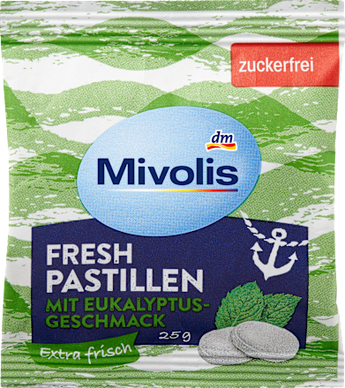 Fresh Pastiller från Mivolis smakar utsökt av eukalyptus och kan ge en behagligt frisk andedräkt. Receptet för pastillerna är veganskt och fritt från gluten, laktos och socker. Dessutom är eukalyptuspastillerna perfekta att ha med sig på resan.