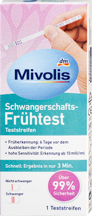 Mivolis graviditetstest för tidig upptäckt med ökad känslighet (kan användas redan 6 dagar före utebliven mens). 1 teststicka för egen användning hemma.