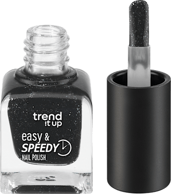 Easy & Speedy Nail Polish från trend !t up med färgnummer 450 black glitter är snabbtorkande och håller i upp till sex dagar. Tack vare den speciella Feel Good Complex stärks och vårdas naglarna optimalt. Dessutom imponerar nagellacket med enkel applicering och strålande glans i glittrande svart.