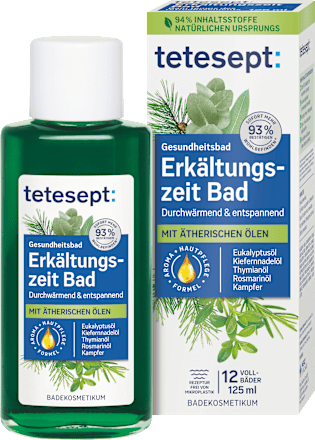 Förkylningsbadet från tetesept är idealiskt för avkopplande stunder i badkaret. Badtillsatsen är välgörande och berikad med en naturlig dofteffekt. Dessutom består badet av naturliga eteriska oljor som eukalyptusolja, tallbarrsolja, timjanolja, rosmarinolja kombinerat med kamfer.