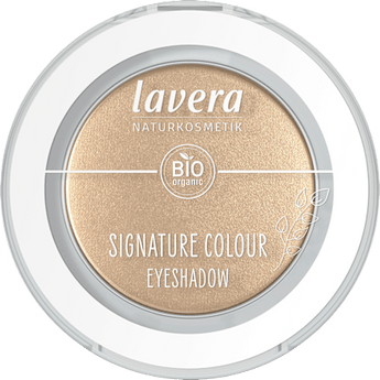 Ögonskuggan Signature Colour i nyansen 08 Dazzling Gold från lavera får ögonen att stråla som gnistrande diamanter. Den högpigmenterade, krämiga texturen ger en intensiv färgavlämning och är enkel att tona ut utan att lägga sig i ögonlocksvecket. Mineraliska färgpigment garanterar extra lång hållbarhet, medan ekologisk mandelolja och vitamin E vårdar de känsliga ögonlocken varsamt. Den veganska ögonskuggan är fri från silikoner, mineralolja och mikroplast och är dermatologiskt och oftalmologiskt testad, vilket gör den idealisk även för kontaktlinsbärare.